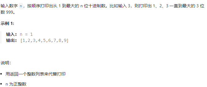 剑指 Offer 17. 打印从1到最大的n位数(简单)