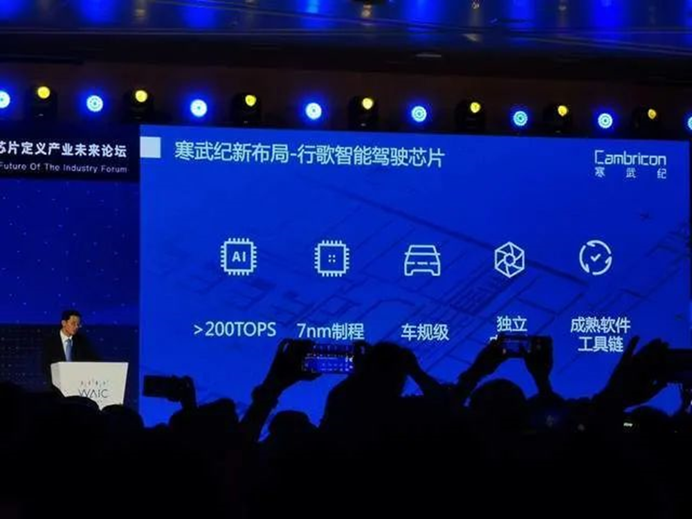 图:行歌科技展示智能驾驶芯片而另一家再现裁员传闻的是本土AI芯片龙头寒武纪位于南京的控股子公司寒武纪行歌(南京)科技有限公司,后者主要设计智能驾驶芯片,曾在2022年披露将推出算力超过200TOPS、7nm制程工艺的首款车载智能驾驶SoC。