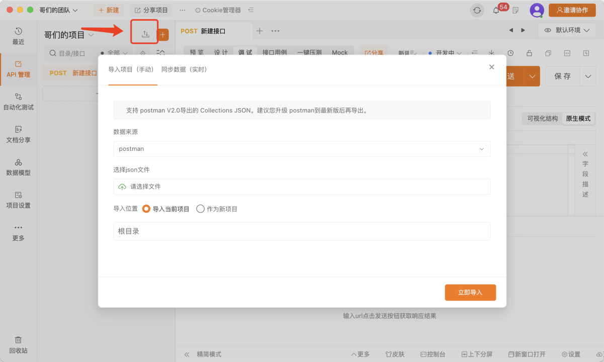 可以从其他平台如postman导入脚本文件,或创建接口。