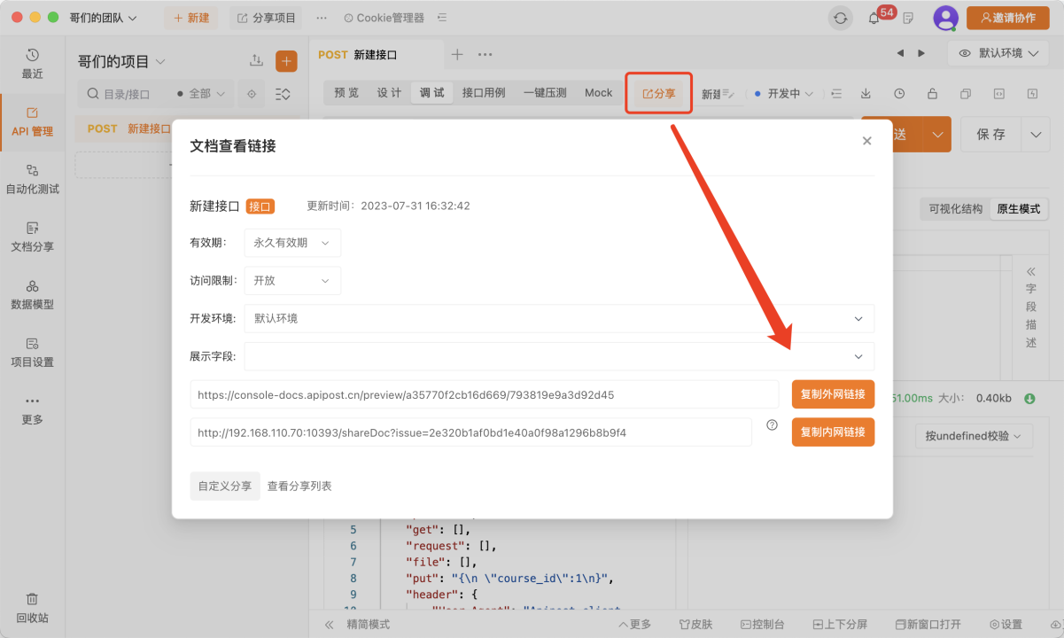 点击分享文档即可生成标准的接口文档,可以将链接分享给需要查看接口的其他同事
