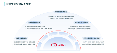 基于在云原生安全领域的持续深耕,天翼云总结出了云原生安全建设五步走策略,通过建设安全基础框架、推进安全标准和融云化、加强安全左移能力、安全运营能力成熟化、平台化实现安全响应闭环五大步骤,助力企业快速构建完备的安全防护体系,实现云基础设施和云上业务系统的原生安全。