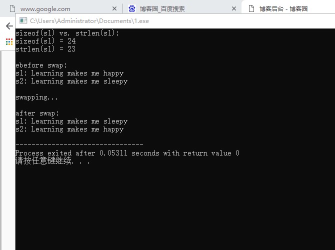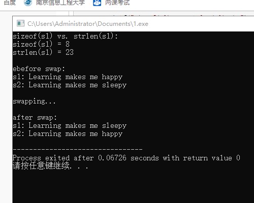 # include <stdio.h> # include <string.h> # define N 80 int main() { char *s1 = "Learning makes me happy"; char *s2 = "Learning makes me sleepy"; char *tmp; printf("sizeof(s1) vs. strlen(s1): \n"); printf("sizeof(s1) = %d\n", sizeof(s1)); printf("strlen(s1) = %d\n", strlen(s1)); printf("\nebefore swap: \n"); printf("s1: %s\n",s1); printf("s2: %s\n",s2); printf("\nswapping...\n"); tmp = s1; s1 = s2; s2 = tmp; printf("\nafter swap:\n"); printf("s1: %s\n",s1); printf("s2: %s\n",s2); return 0; }