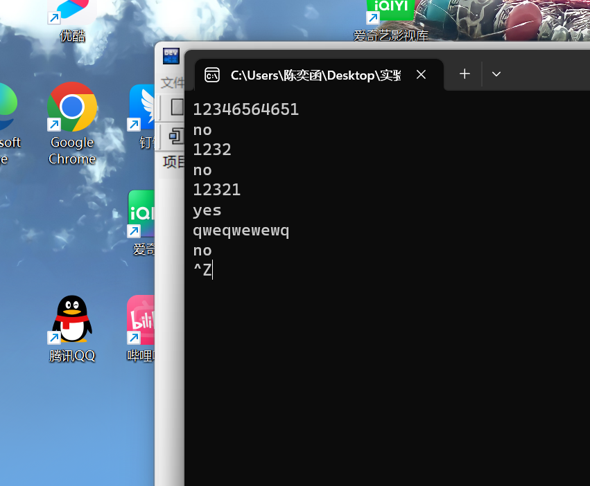 # include <stdio.h> # define N 80 int func(char *); int main(){ char str[80]; while (gets(str)!= NULL){ if(func(str)) printf("yes\n"); else printf("no\n"); } return 0; } int func(char *str) { char *begin, *end; begin = end = str; while (*end) end++; end--; while(begin<end) { if(*begin !=*end) return 0; else { begin++; end--; } } return 1; }