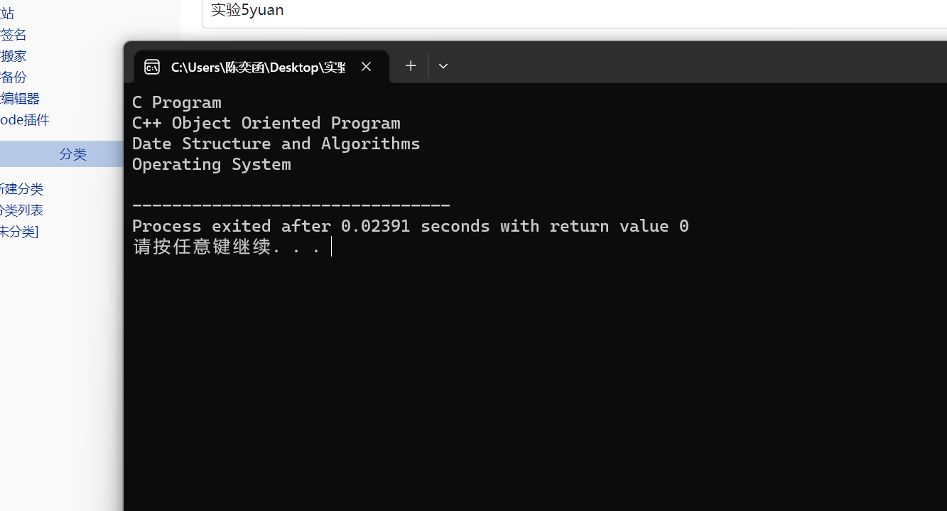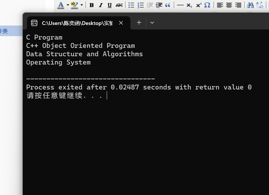 #include<stdio.h> #include<string.h> void sort(char *name[], int n); int main() { char *course[4] = { "C Program", "C++ Object Oriented Program", "Operating System", "Date Structure and Algorithms"}; int i; sort(course, 4); for(i = 0; i <4; i++) printf("%s\n", course[i]); return 0; } void sort(char *name[], int n) { int i, j; char *tmp; for(i = 0; i <n - 1; ++i) for(j = 0; j < n - 1; ++j) if(strcmp(name[j], name[j + 1]) > 0) { tmp = name[j]; name[j] = name[j + 1]; name[j + 1] = tmp; } }