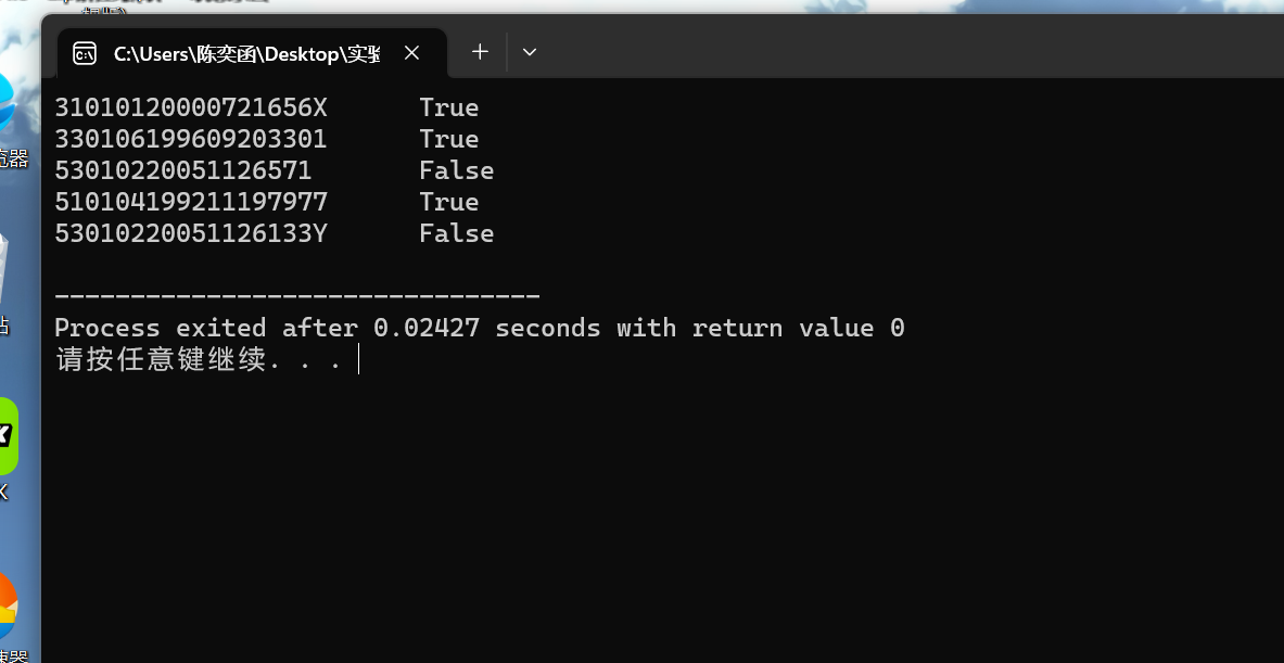 #include <stdio.h> #include <string.h> #define N 5 int check_id(char *str); // 函数声明 int main() { char *pid[N] = {"31010120000721656X", "330106199609203301", "53010220051126571", "510104199211197977", "53010220051126133Y"}; int i; for (i = 0; i < N; ++i) if (check_id(pid[i])) // 函数调用 printf("%s\tTrue\n", pid[i]); else printf("%s\tFalse\n", pid[i]); return 0; } // 函数定义 // 功能: 检查指针str指向的身份证号码串形式上是否合法。 // 形式合法,返回1,否则,返回0 int check_id(char *str) { int flag = 0; char *tmp; tmp = str; while((*tmp >= '0' && *tmp <= '9') || *tmp == 'X') tmp++; if(*tmp == '\0' && strlen(str) == 18) flag = 1; return flag; }