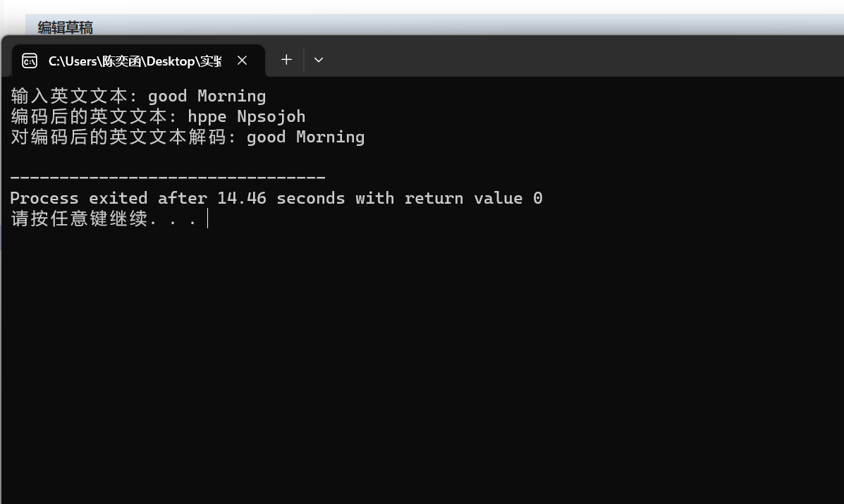 #include <stdio.h> #define N 80 void encoder(char *s); // 函数声明 void decoder(char *s); // 函数声明 int main() { char words[N]; printf("输入英文文本: "); gets(words); printf("编码后的英文文本: "); encoder(words); // 函数调用 printf("%s\n", words); printf("对编码后的英文文本解码: "); decoder(words); // 函数调用 printf("%s\n", words); return 0; } /*函数定义 功能:对s指向的字符串进行编码处理 编码规则: 对于a~z或A~Z之间的字母字符,用其后的字符替换; 其中,z用a替换,Z用A替换 其它非字母字符,保持不变 */ void encoder(char *s) { while(*s) { if((*s >= 'a' && *s < 'z') || (*s >= 'A' && *s < 'Z')) *s = *s+1; else if(*s == 'z' || *s == 'Z') *s = *s-25; s++; } } /*函数定义 功能:对s指向的字符串进行解码处理 解码规则: 对于a~z或A~Z之间的字母字符,用其前面的字符替换; 其中,a用z替换,A用Z替换 其它非字母字符,保持不变 */ void decoder(char *s) { while(*s) { if((*s > 'a' && *s <= 'z') || (*s > 'A' && *s <= 'Z')) *s = *s-1; else if(*s == 'a' || *s == 'A') *s = *s+25; s++; } }