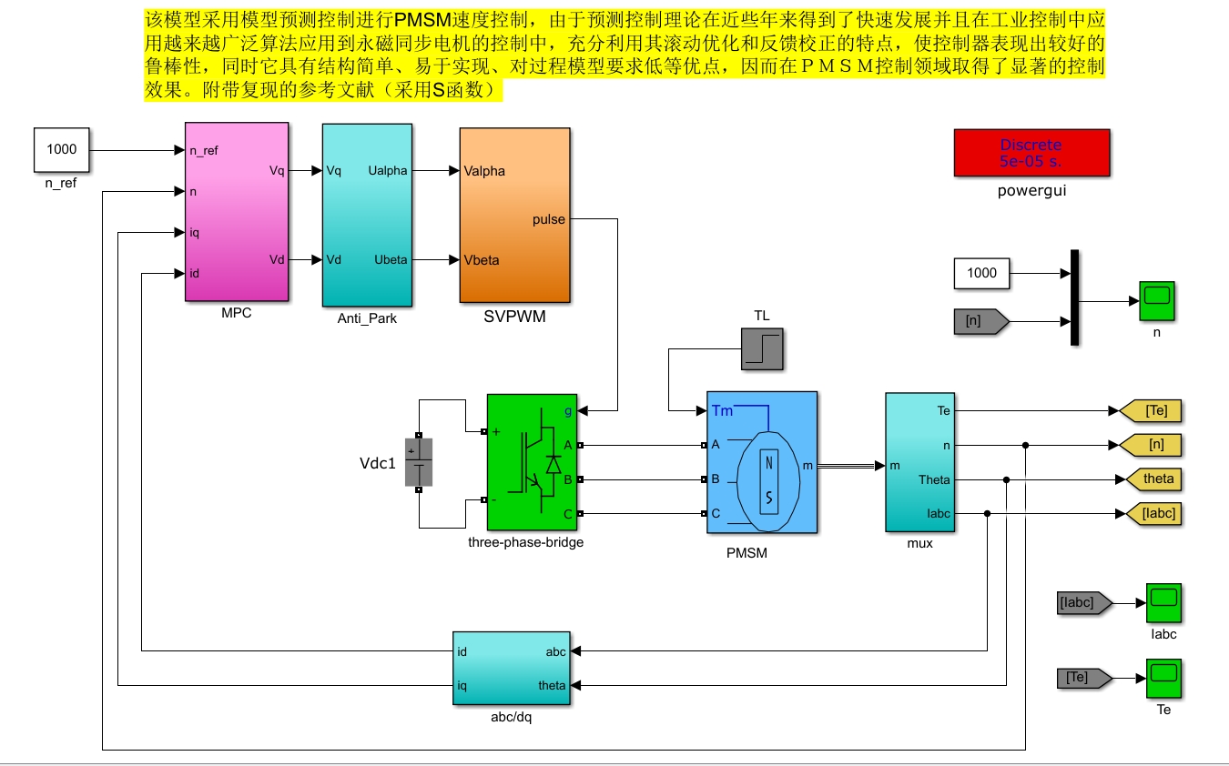 该模型采用模型预测控制进行PMSM速度控制,由于预测控制理论在近些年来得到了快速发展并且在工业控制中应用