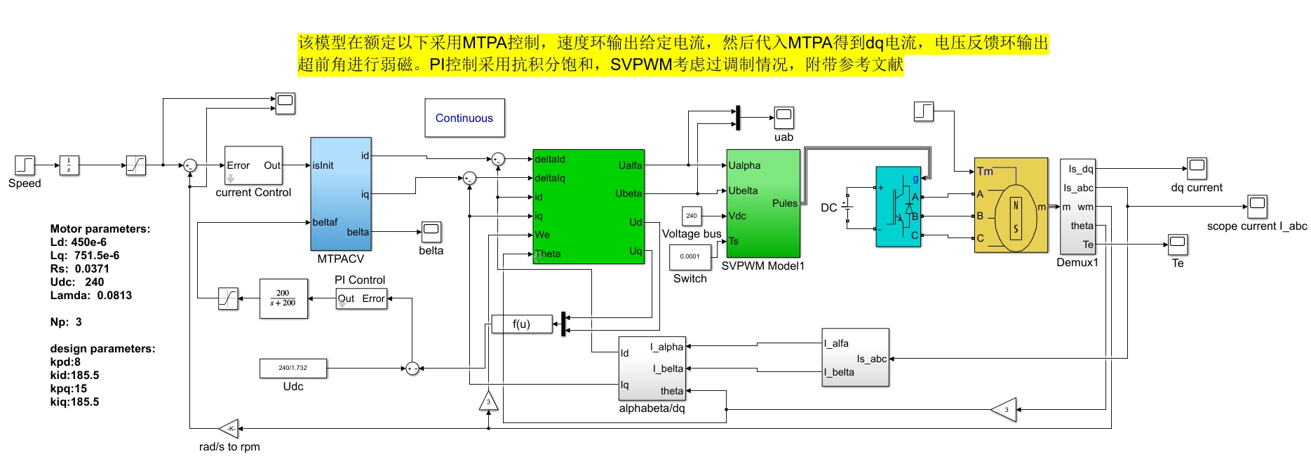 该模型在额定以下采用MTPA控制,速度环输出给定电流,然后代入MTPA得到dq电流,电压反馈环输出超前角进行弱