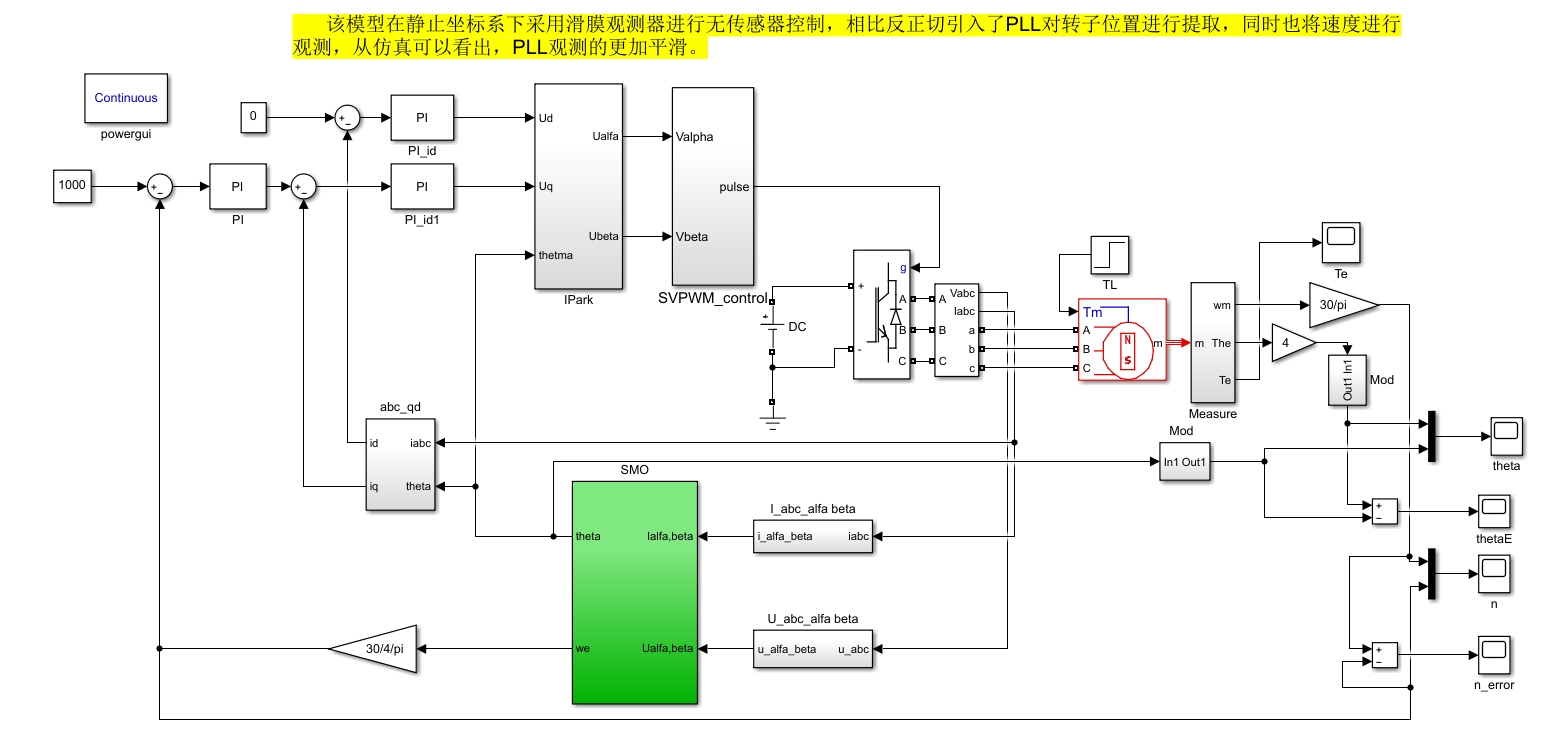 该模型在静止坐标系下采用滑膜观测器进行无传感器控制,相比反正切引入了PLL对转子位置进行提取,同时也将速度进行观测,从仿真可以看出,PLL观测的更加平滑。