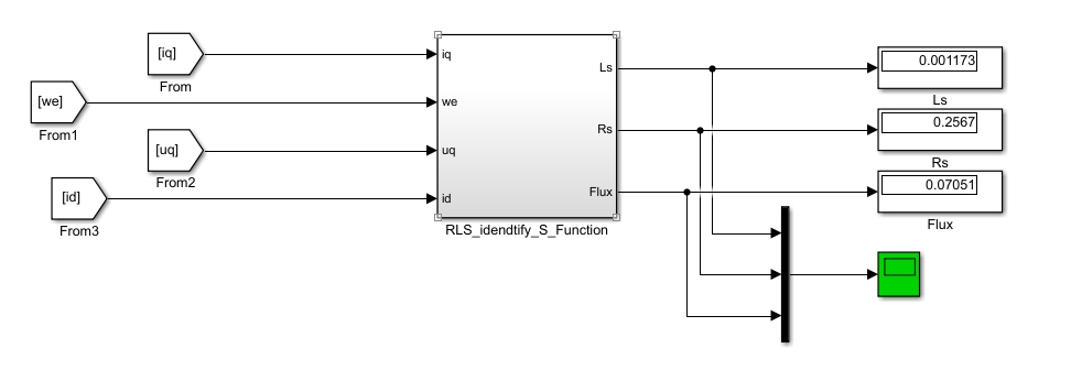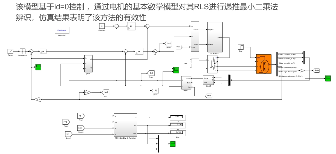 该模型基于id=0控制 ,通过电机的基本数学模型对其定子电阻R, 永磁磁链ψf, dq轴电感Ls进行递推最小二乘法辨识,仿真结果表明了该方法的有效性