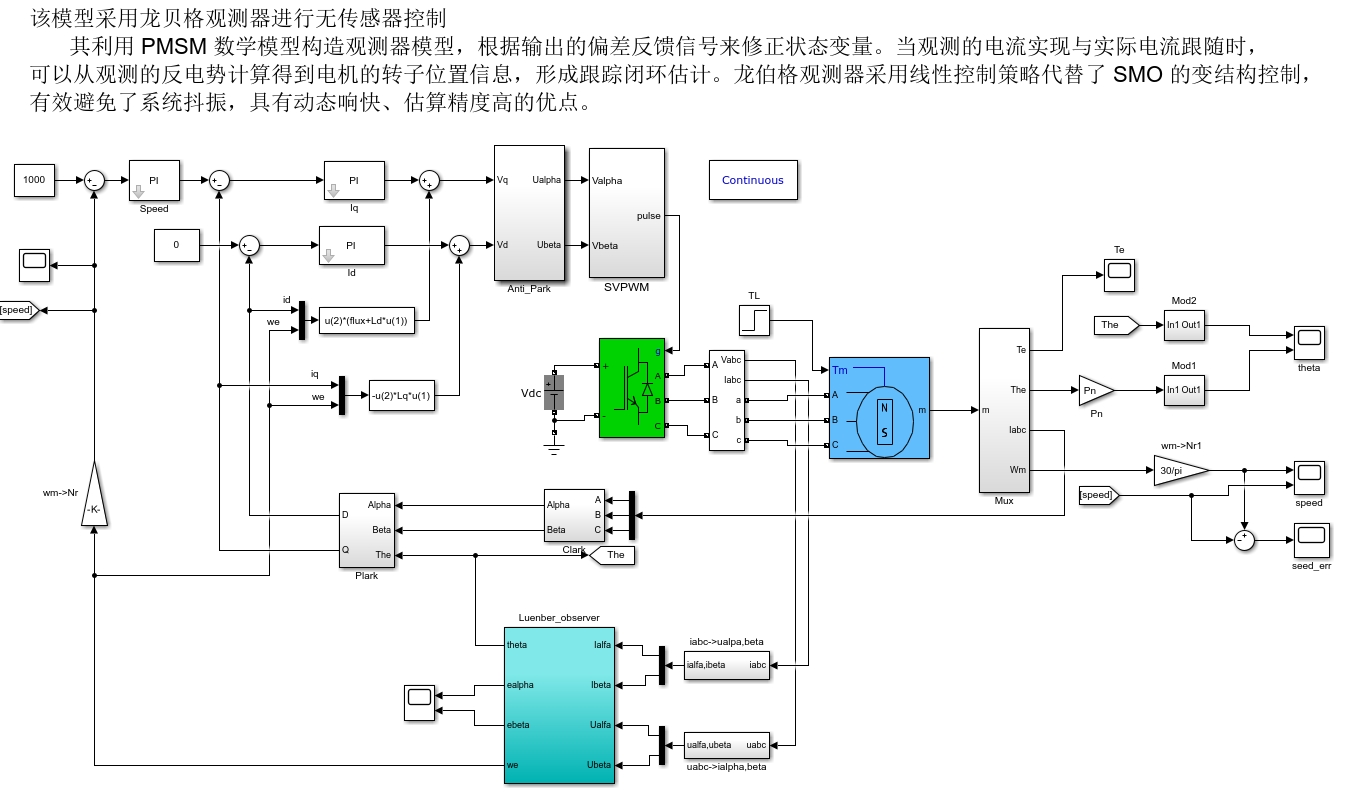 该模型采用龙贝格观测器进行无传感器控制 其利用 PMSM 数学模型构造观测