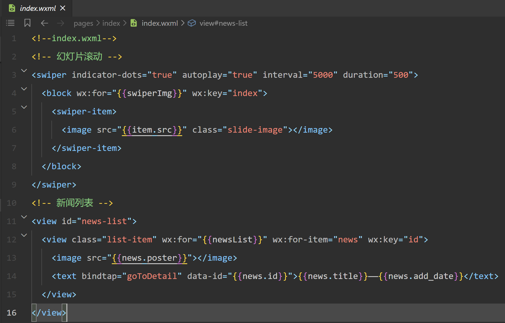 pages/index/index.wxml中编写代码,使用wx:for循环显示幻灯片内容和新闻列表数据。