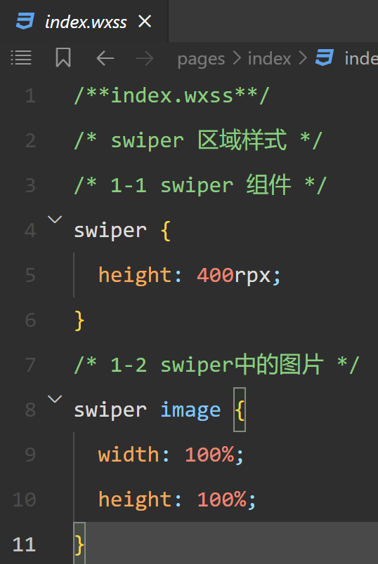 pages/index/index.wxss中编写样式表,展示幻灯片和新闻列表。