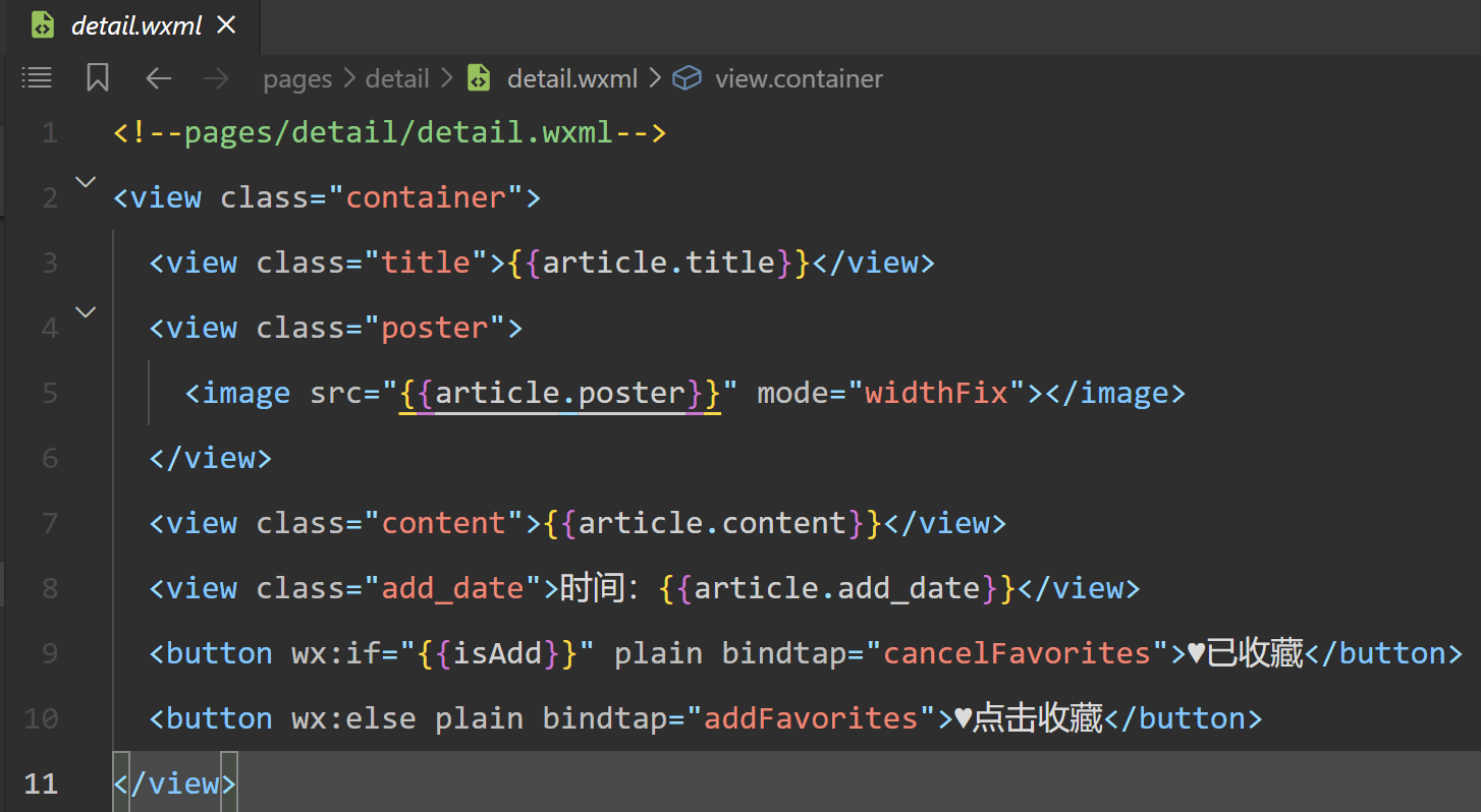 在pages/detail/detail.js中实现以上3个函数,并在pages/detail/detail.wxml中添加<button>组件实现收藏功能。需要在文件开头声明var common = require('../../utils/common.js')才能使用common.js中的getNewsDetail函数。