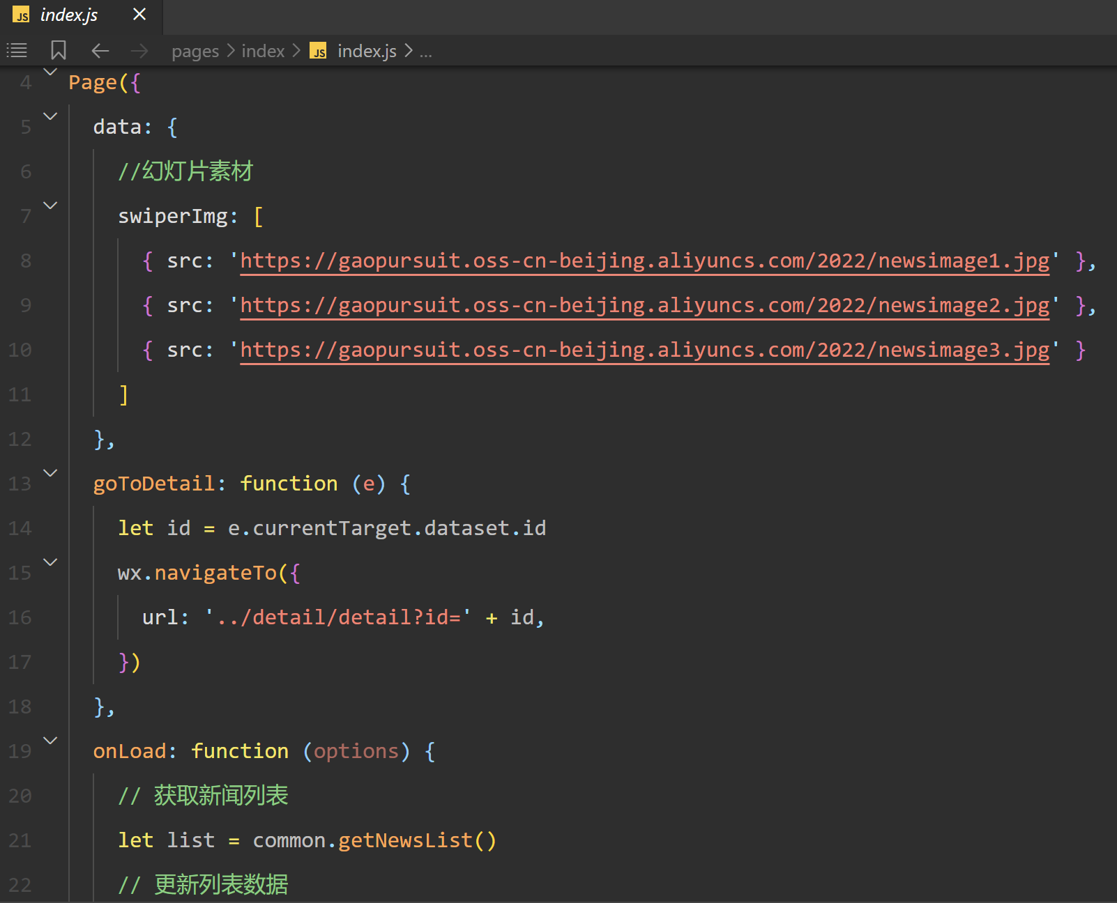 pages/index/index.js中实现以上两个函数,并在pages/index/index.wxml中添加相应的点击事件。需要在文件开头声明var common = require('../../utils/common.js')才能使用common.js中的getNewsList函数。