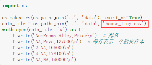 这是一个.csv格式(用逗号隔开)的数据文件。该数据集有四行三列。其中每行描述了房间数量(“NumRooms”)、巷
