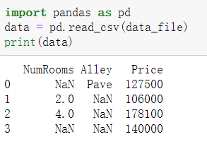 注意,“NaN”项代表缺失值。 为了处理缺失的数据,典型的方法包括插值法和删除法, 其中插值法用一个替代值弥补缺失值,而删除法则直接忽略缺失值。 在这里,我们将考虑插值法。