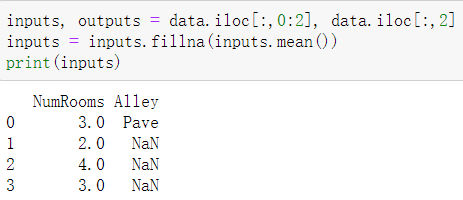 通过位置索引iloc,我们将data分成inputs和outputs, 其中前者为data的前两列,而后者为data的最后一列。 对于inputs中缺少的数值,我们用同一列的均值替换“NaN”项。