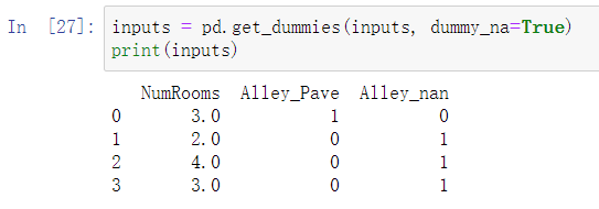 对于inputs中的类别值或离散值,我们将“NaN”视为一个类别。 由于“巷子类型”(“Alley”)列只接受两种类型的类别值“Pave”和“NaN”, pandas可以自动将此列转换为两列“Alley_Pave”和“Alley_nan”。 巷子类型为“Pave”的行会将“Alley_Pave”的值设置为1,“Alley_nan”的值设置为0。 缺少巷子类型的行会将“Alley_Pave”和“Alley_nan”分别设置为0和1。