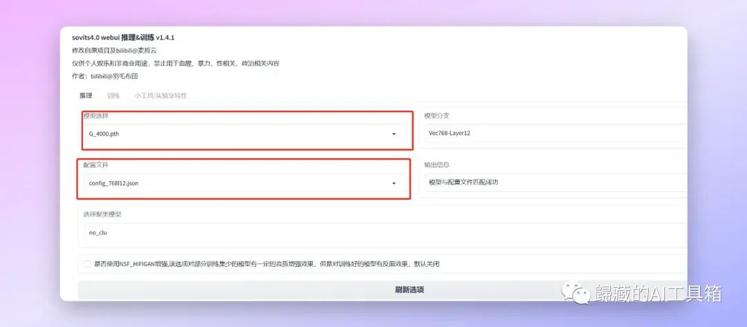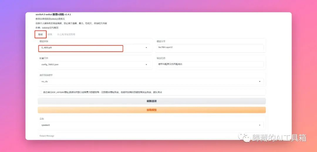 如果你觉得可以了暂停训练之后回到推理 Tab 就能看到你刚才训练的模型了,可能会有好几个因为你选的最多保留十个。按照我们第一期的内容正常使用就可以了。