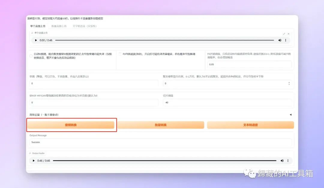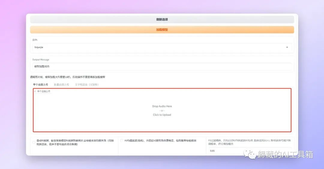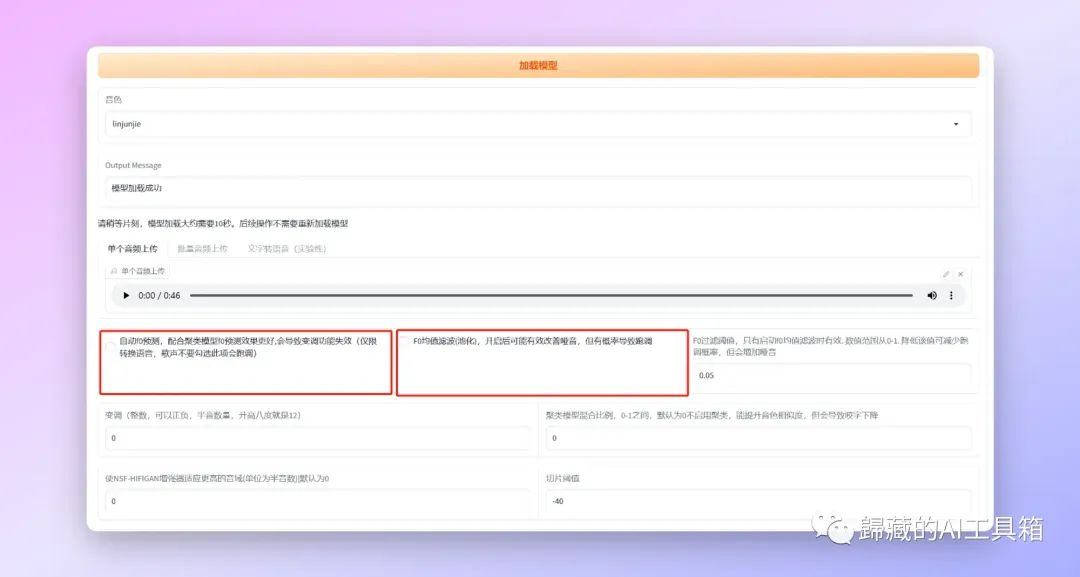 接下来是两个比较重要的选项【聚类f0】会让输出效果更好,但是如果你的文件是歌声的话不要勾选这个选项,不然会疯狂跑调。【F0均值滤波】主要解决哑音问题,如果你输出的内容有比较明显的哑音的话可以勾选尝试一下,这个选项歌声可以使用。