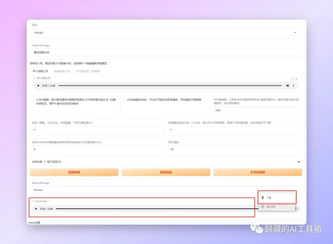 【output audio】的位置就是生成的音频了可以试听,如果觉得OK的话可以,点击右边三个点弹出的下载按钮下载。