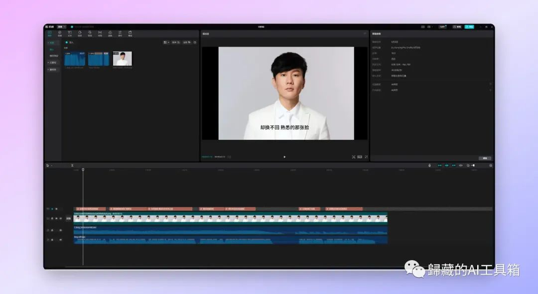 我们现在生成的是一段只有人声的干声,这时候我们刚才剥离出来的伴奏就有用了,把两段音频合成就行,我用的剪映,直接把两段音轨拖进去导出就行,也可以加张图片变成视频。