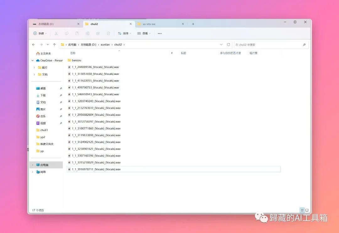 处理完成后扔掉分离出来的伴奏,只留下人声素材,整理好备用。类似我下图这样扔到一个文件夹里。