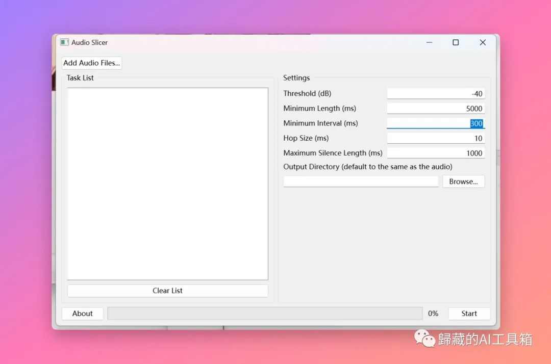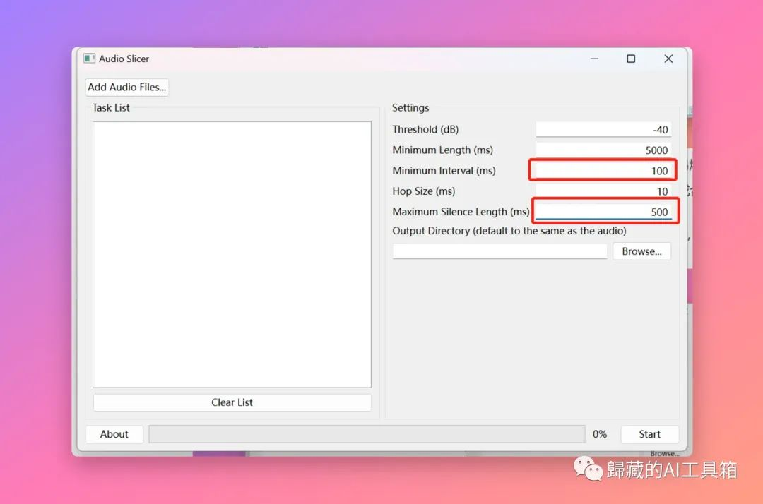 把你你准备好的人声素材拖到【Task List】里面,在Output位置设置好输出文件夹的位置,然后点Start就可以开始分割了。