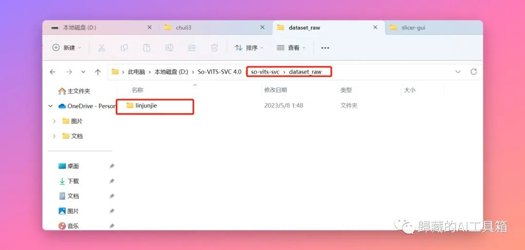 所有数据处理好之后,我们准备开始训练了首先需要把准备好的素材移动到\so-vits-svc\dataset_raw这个文件夹下,注意不要直接把素材放在dataset_raw文件夹里,拿个文件夹装好放进去,所有的目录不要有中文字符。