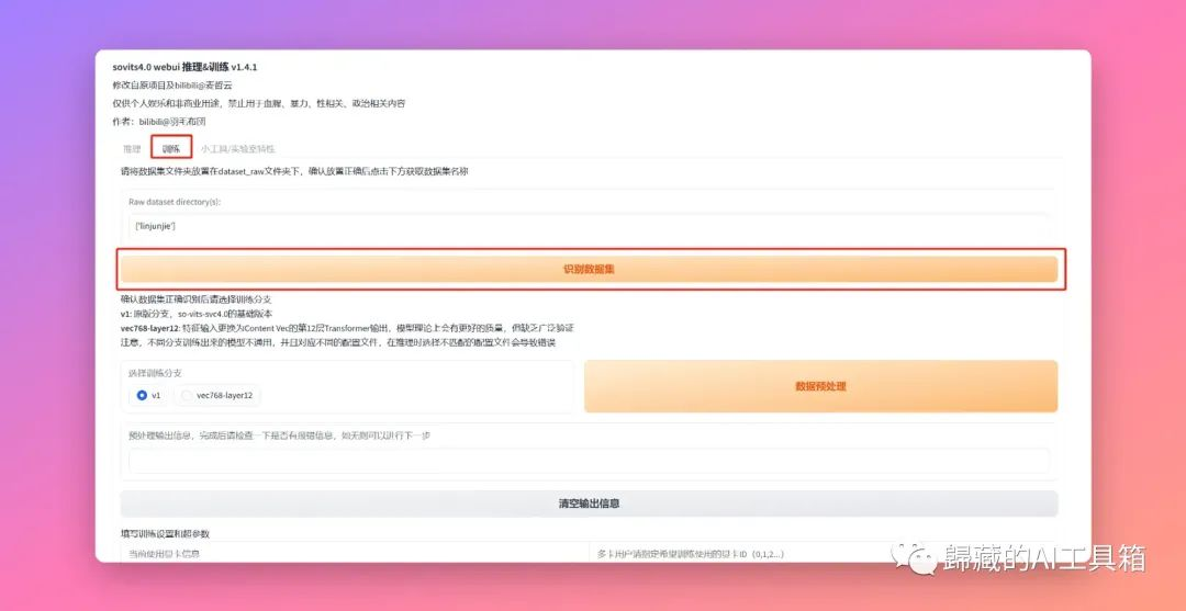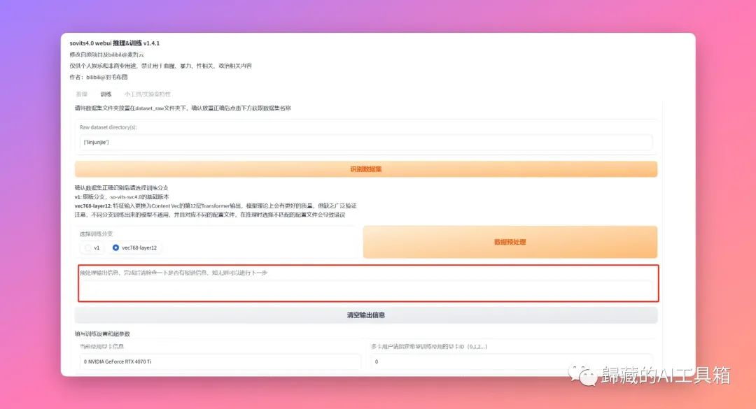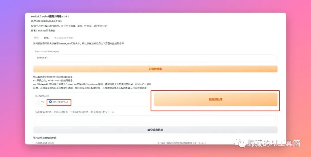 之后就是选择与训练分支了,【vec768-layer12】好像效果会好一些,所以这里我选了这个分支。后就是点击【数据预处理】。
