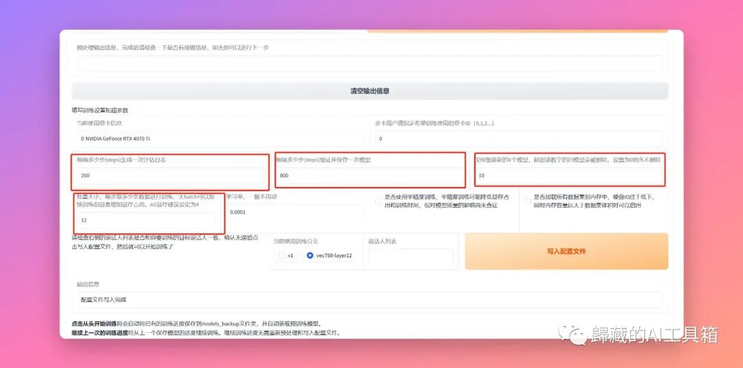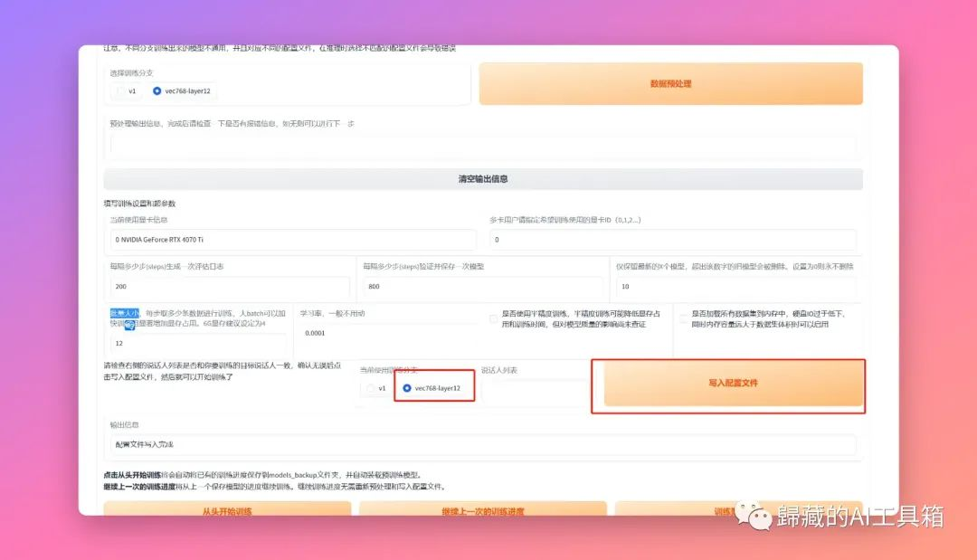 上面几个参数设置完之后,我们选择当前训练分支跟我们数据预处理的时候的一致就行,然后点击写入配置文件,输出信息那里会有写入的结果,如果有报错也会显示在那里。