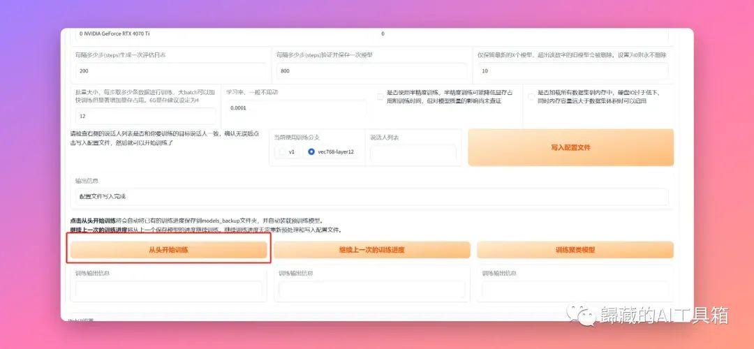 如果你是第一次训练点击这个【从头开始训练】就行,如果你之前训练过你还想继续训练的话就点这个【继续上一次训练进度】。如果你之前有训练进度,然后你点了【从头开始】的话你的训练进度就会被清空,从新开始从第0步训练。