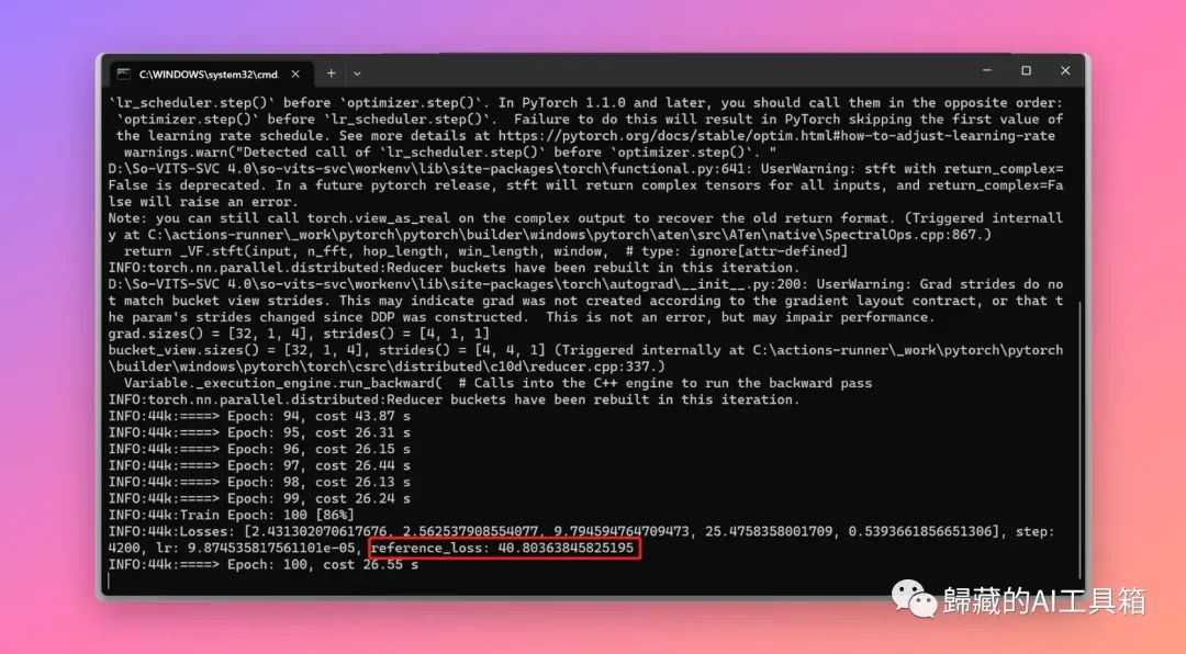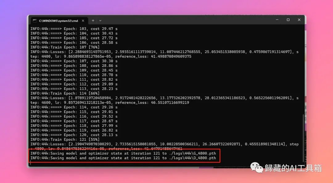 在你点击按钮之后会弹出这样一个弹窗里面就是训练进度,我框起来的地方就是每200步输出的信息,那个loss的值就是判断模型质量好坏的标准,越低越好,如果你觉得现在的已经可以了的话按CTAL+C键就会停止训练,你可以去推理tab下尝试你的模型,如果不满意还是可以重新回来训练的。