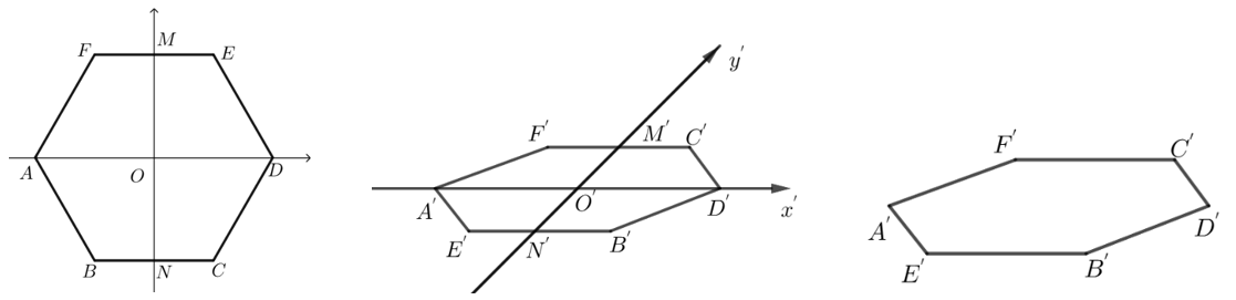 ③ 画对应图形: 在已知图形平行于\(x\)轴的线段, 在直观图中画成平行于\(x'\)轴, 长度保持不变.在已知图形平行于\(y\)轴的线段, 在直观图中画成平行于\(y'\)轴, 且长度为原来一半.