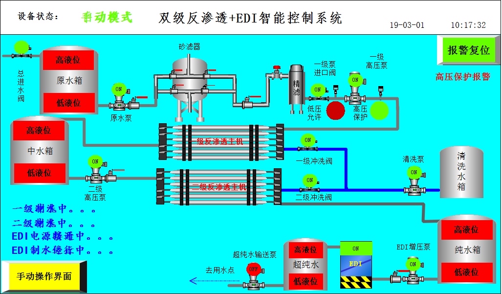 系统采用成熟、可靠、先进、自动化程度高的二级反渗透+EDI除盐水处理工艺,确保处理后的超纯水水质确保处理后出水电阻率达到18.2MΩ.cm,采用PLC+触摸屏控制,全套系统自动化程度高,系统稳定性高。