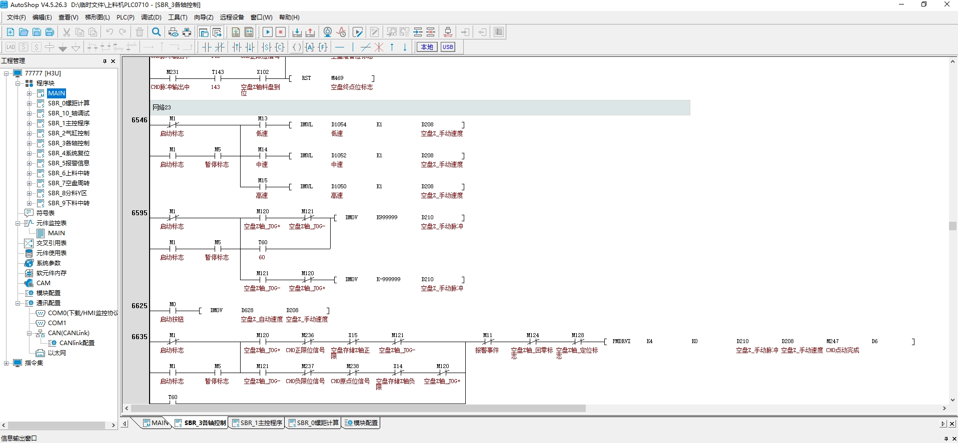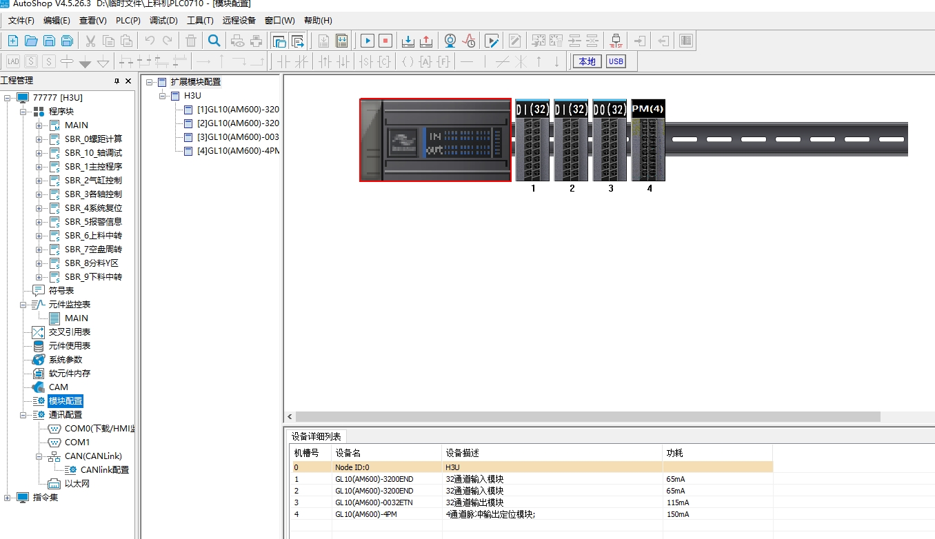 汇川H3U带10轴(3伺服7步进)+IT6100E触摸屏项目,上下料机,7个步进加了一个4PM定位模块,一个托盘上料,3