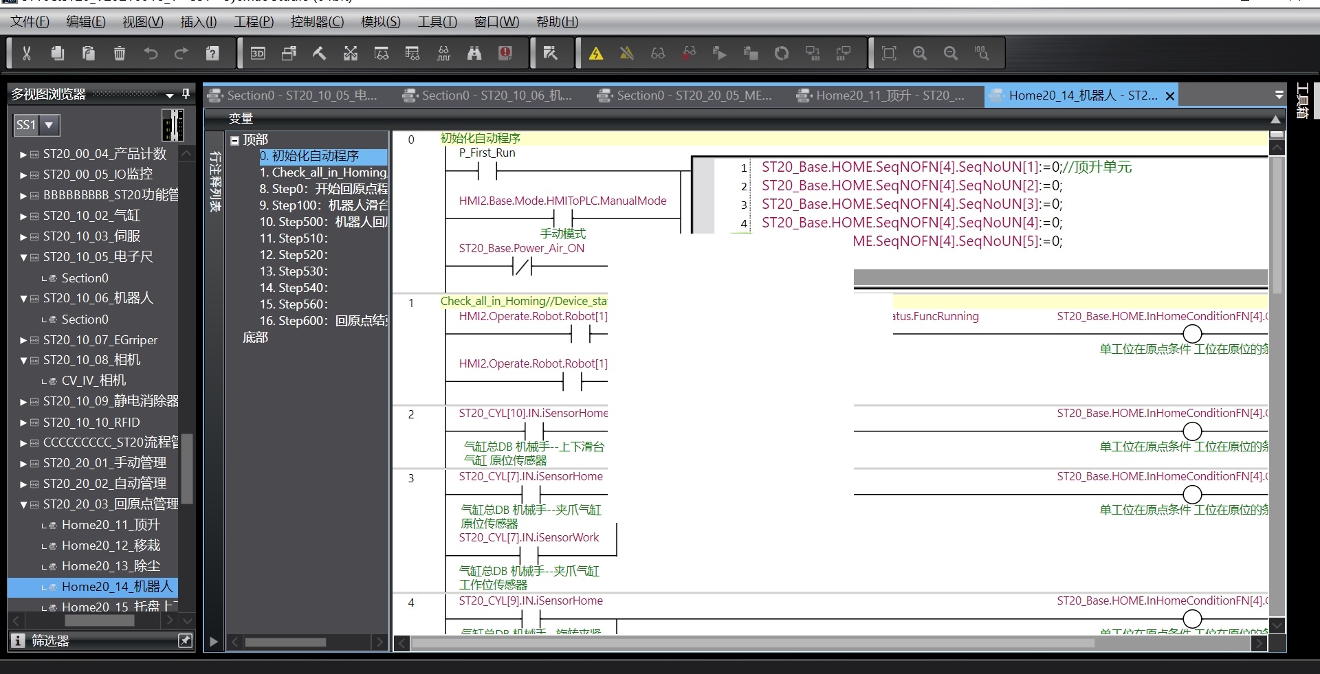 汽车发动机装配站,涵盖人机配方一键换型功能,故障记录功能,产量统计及OEE功能,TCP,视觉通信控制,EIP远程IO通信,松下A6总线伺服控制,优质的触摸屏程序模板,欧姆龙强大的结构体等应用,气缸报警功能块,真空报警功能块,伺服控制功能块,相机控制功能块,等等