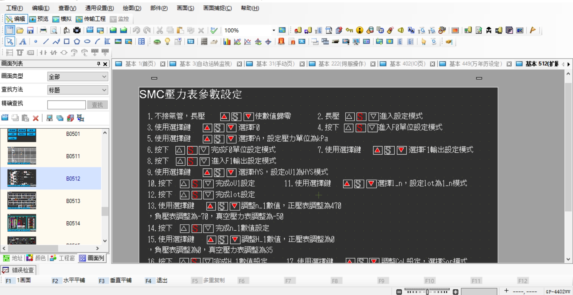 触摸屏配有SMC压力表参数设置详解,IR测试仪器详解,伺服电机详解,变频器报警详解,等等
