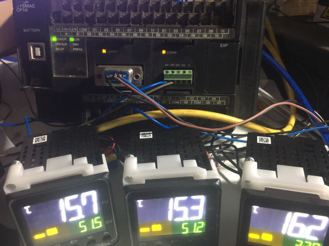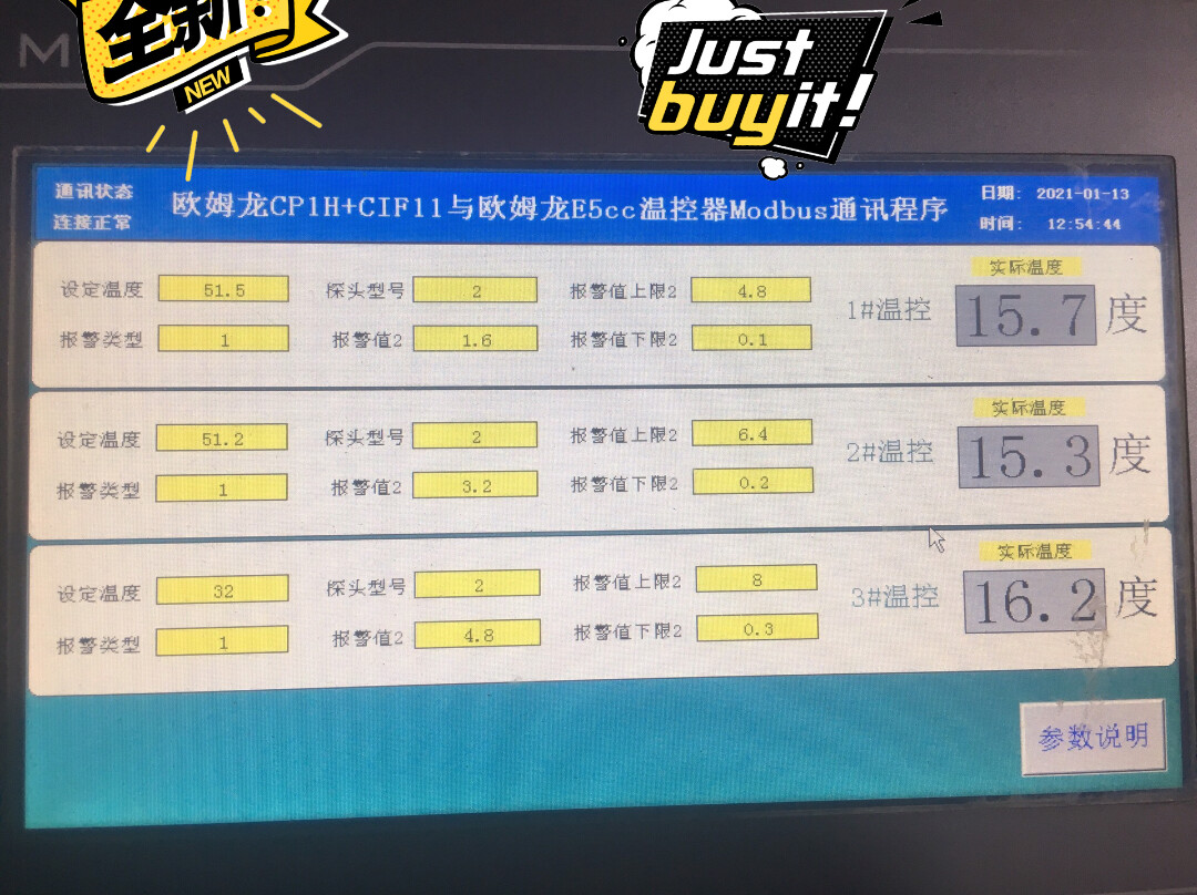 器件:欧姆龙CP1H,CP1W CIF11串口网关板,3台欧姆龙E5CC RX2ASM 802温控器,昆仑通态TPC7062KD触摸屏。
