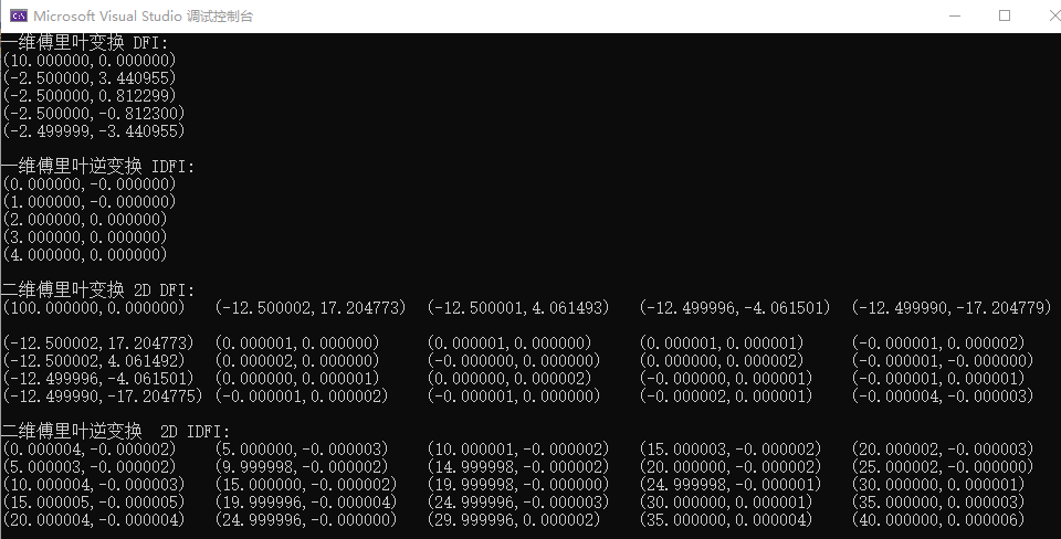 #include <stdio.h> #include <math.h> #define pi 3.1415926 typedef struct { float re;// really float im;// imaginary }complex, * pcomplex; complex complexadd(complex a, complex b) //复数加 { complex rt; rt.re = a.re + b.re; rt.im = a.im + b.im; return rt; } complex complexMult(complex a, complex b) //复数乘 { complex rt; rt.re = a.re * b.re - a.im * b.im; rt.im = a.im * b.re + a.re * b.im; return rt; } //离散傅里叶变换 void dft(complex F[], complex x[], int N) //X[]标识变换后频域,x[]为时域采样信号,下同 { float data_re[10]; float data_im[10]; complex temp; complex data; int k, n; for (int k = 0; k < N; k++) { F[k].re = 0; F[k].im = 0; for (int n = 0; n < N; n++) { temp.re = (float)cos(2 * pi * k * n / N); temp.im = -(float)sin(2 * pi * k * n / N); F[k] = complexadd(F[k], complexMult(x[n], temp)); data = complexadd(F[k], complexMult(x[n], temp)); data_re[n] = temp.re; data_im[n] = temp.im; } } } //离散傅里叶逆变换 void idft(complex X[], complex x[], int N) { complex temp; int k, n; for (int k = 0; k < N; k++) { x[k].re = 0; x[k].im = 0; for (int n = 0; n < N; n++) { temp.re = (float)cos(2 * pi * k * n / N); temp.im = (float)sin(2 * pi * k * n / N); x[k] = complexadd(x[k], complexMult(X[n], temp)); } x[k].re /= N; x[k].im /= N; } } //二维数组的傅里叶变换 void dft2d(complex F[][5], complex x[][5], int N) { complex temp; complex data; int k, n, i, j; for (i = 0; i < N; i++) { for (j = 0; j < N; j++) { F[i][j].re = 0; F[i][j].im = 0; for (k = 0; k < N; k++) { for (n = 0; n < N; n++) { temp.re = (float)cos(2 * pi * (k * i + n * j) / N); temp.im = -(float)sin(2 * pi * (k * i + n * j) / N); F[i][j] = complexadd(F[i][j], complexMult(x[k][n], temp)); data = complexadd(F[i][j], complexMult(x[k][n], temp)); } } } } } //二维数组的傅里叶逆变换 void idft2d(complex X[][5], complex x[][5], int N) { complex temp; int k, n, i, j; for (i = 0; i < N; i++) { for (j = 0; j < N; j++) { x[i][j].re = 0; x[i][j].im = 0; for (k = 0; k < N; k++) { for (n = 0; n < N; n++) { temp.re = (float)cos(2 * pi * (k * i + n * j) / N); temp.im = (float)sin(2 * pi * (k * i + n * j) / N); x[i][j] = complexadd(x[i][j], complexMult(X[k][n], temp)); } } x[i][j].re /= N; x[i][j].im /= N; } } } #define N 5 int main() { complex samples[N], X[N], x[N]; //samples[]示例 for (int i = 0; i < N; i++) { samples[i].re = i; samples[i].im = 0; } dft(X, samples, N); printf("一维傅里叶变换 DFI:\n"); for (int i = 0; i < N; i++) { printf("(%f,%f)\n", X[i].re, X[i].im); } printf("\n"); idft(X, x, N); printf("一维傅里叶逆变换 IDFI:\n"); for (int i = 0; i < N; i++) { printf("(%f,%f)\n", x[i].re, x[i].im); } printf("\n"); //二维数组的傅里叶变换示例 complex samples2d[N][N], X2d[N][N], x2d[N][N]; //samples2d[]示例 for (int i = 0; i < N; i++) { for (int j = 0; j < N; j++) { samples2d[i][j].re = i + j; samples2d[i][j].im = 0; } } dft2d(X2d, samples2d, N); printf("二维傅里叶变换 2D DFI:\n"); for (int i = 0; i < N; i++) { for (int j = 0; j < N; j++) { printf("(%f,%f)\t", X2d[i][j].re, X2d[i][j].im); } printf("\n"); } printf("\n"); idft2d(X2d, x2d, N); printf("二维傅里叶逆变换 2D IDFI:\n"); for (int i = 0; i < N; i++) { for (int j = 0; j < N; j++) { printf("(%f,%f)\t", x2d[i][j].re, x2d[i][j].im); } printf("\n"); } }