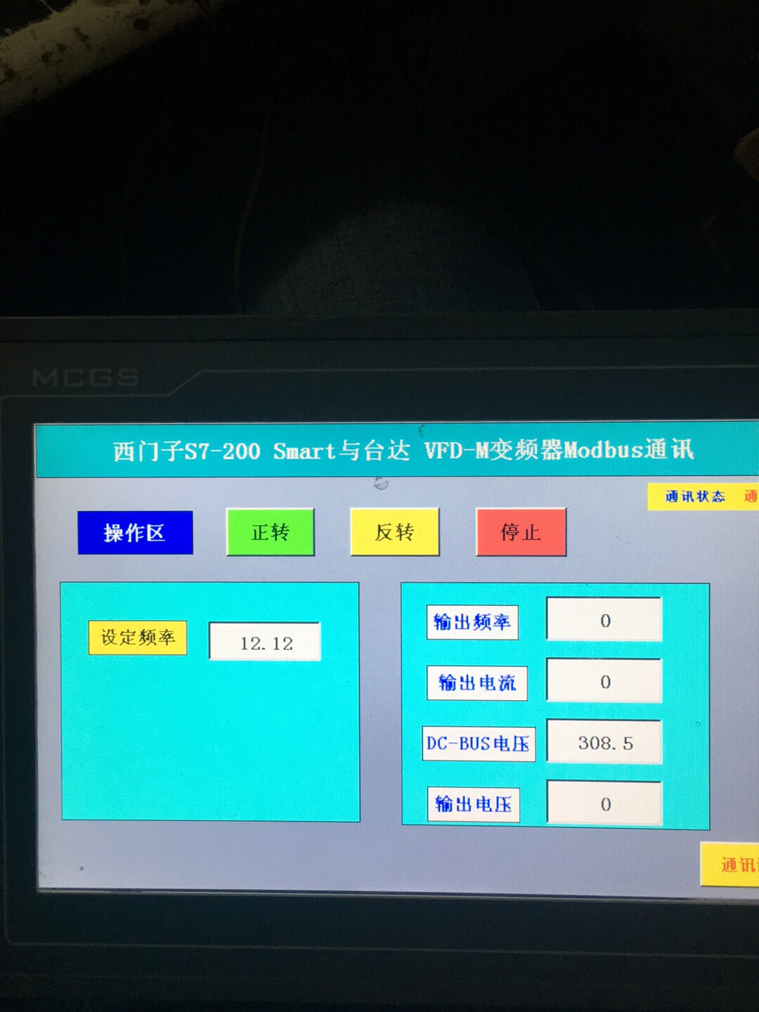 功能:触摸屏控制变频器设定频率,启停,读取输出频率,电流,电压