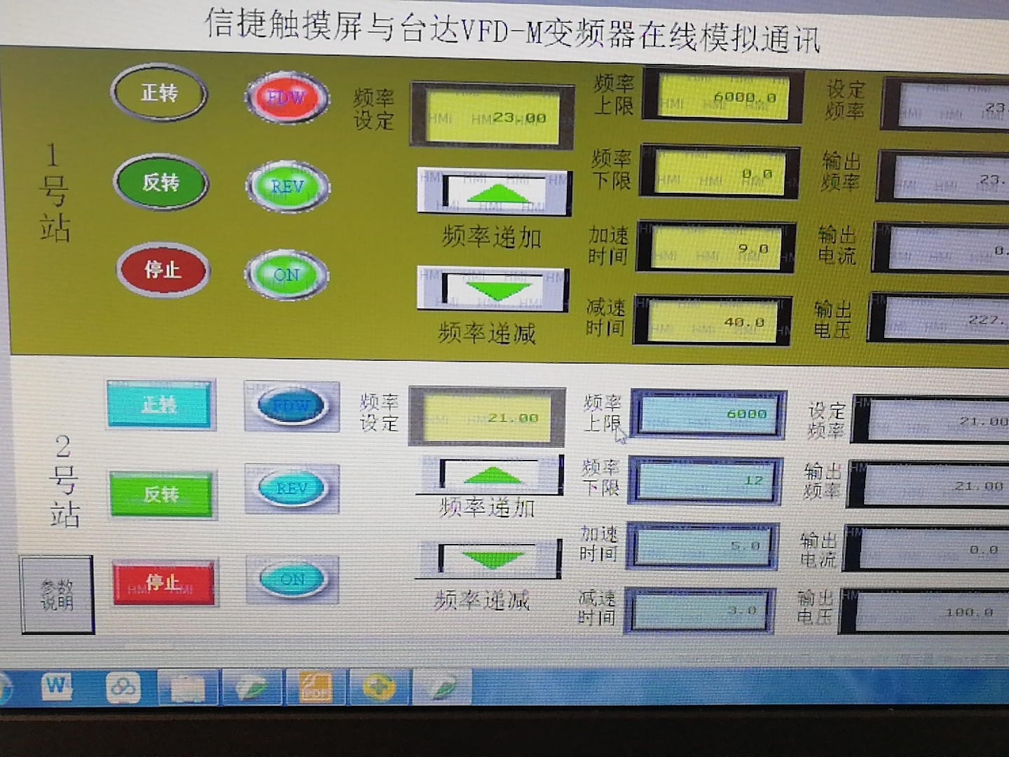 信捷触摸屏与两台变频器的通讯样例支持TH.TG.TE系列,一台使用三菱E700变频器,一台使用台达vfd-M变频器,可实现正反转,停止控制及指示,频率设定及加减频率,加减速时间设定,以及对输出频率,电流,电压的监控。