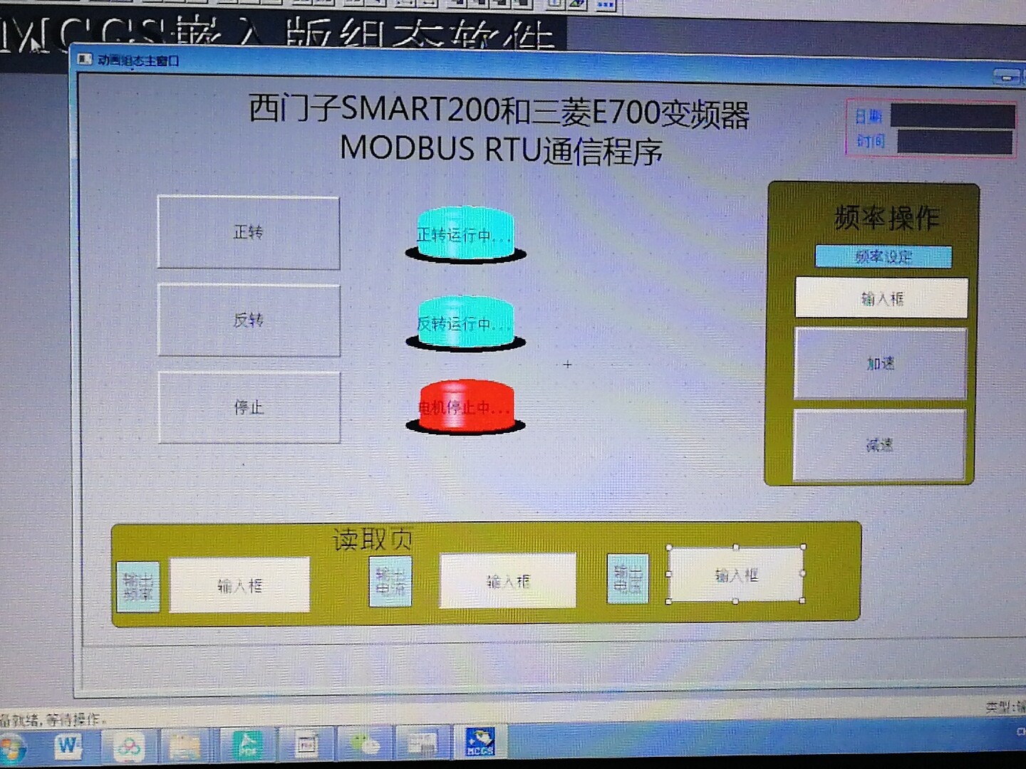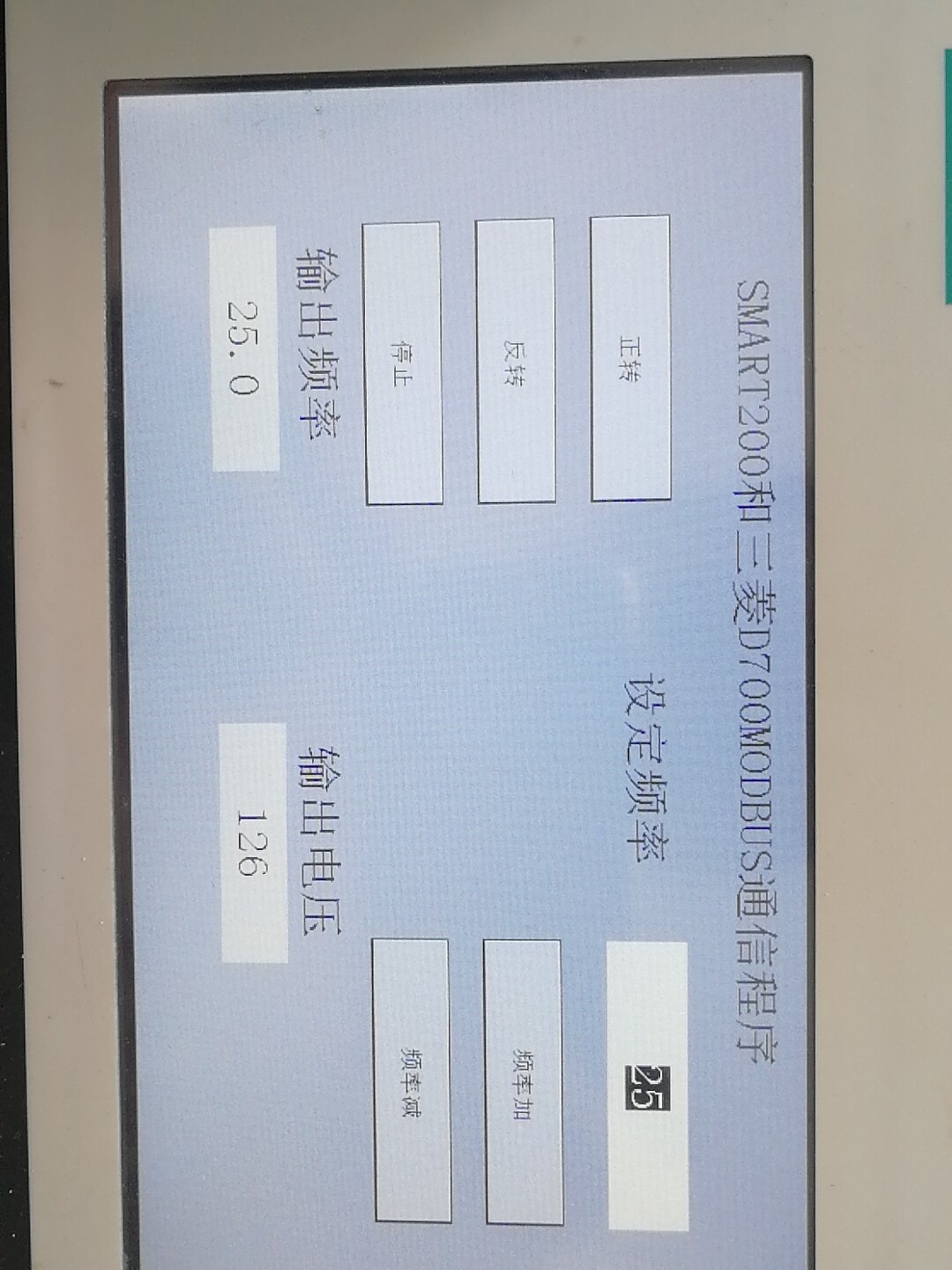 功能:通过MODBUS通信,SMART PLC来控制三菱变频器的正反转,停止和频率的加减速及设定,输出频率输出电压的监控,配smart700触摸屏和mcgs两套屏程序。