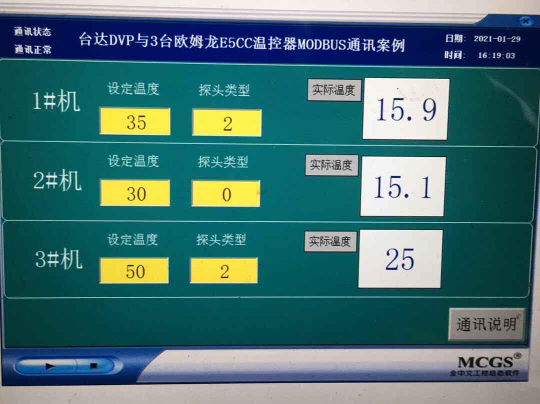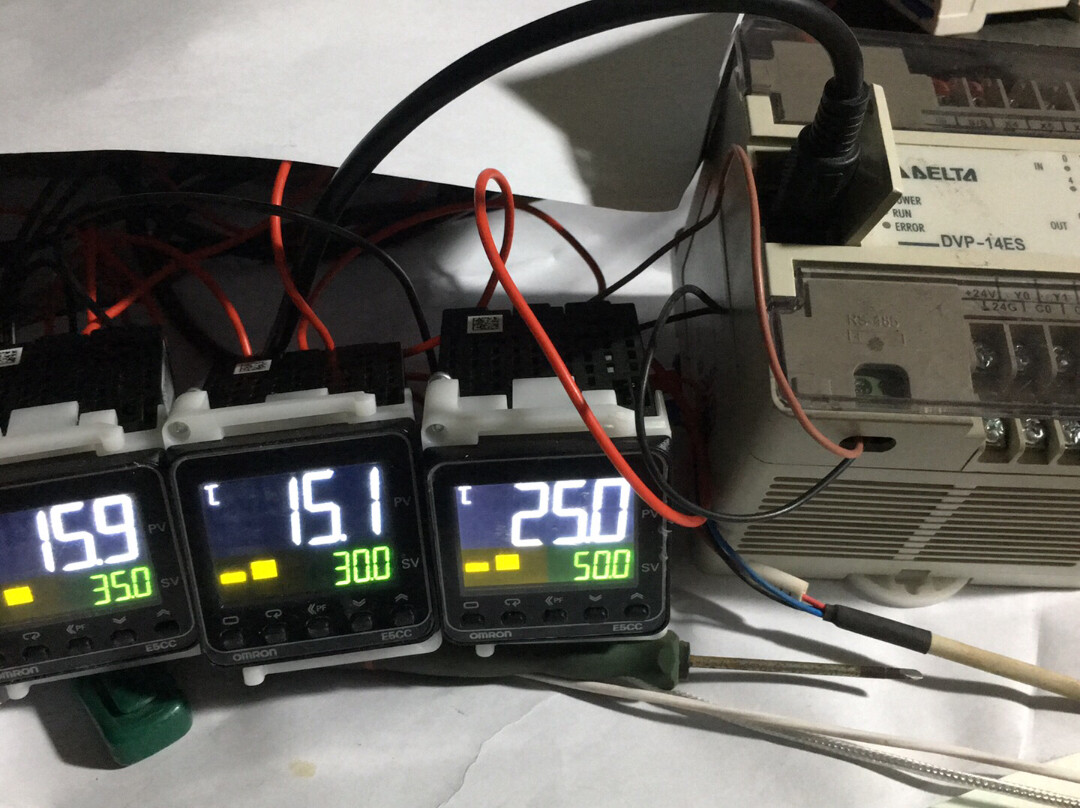 器件:台达DVP ES系列的PLC,3台欧姆龙E5CC系列温控器,昆仑通态,威纶通触摸屏。