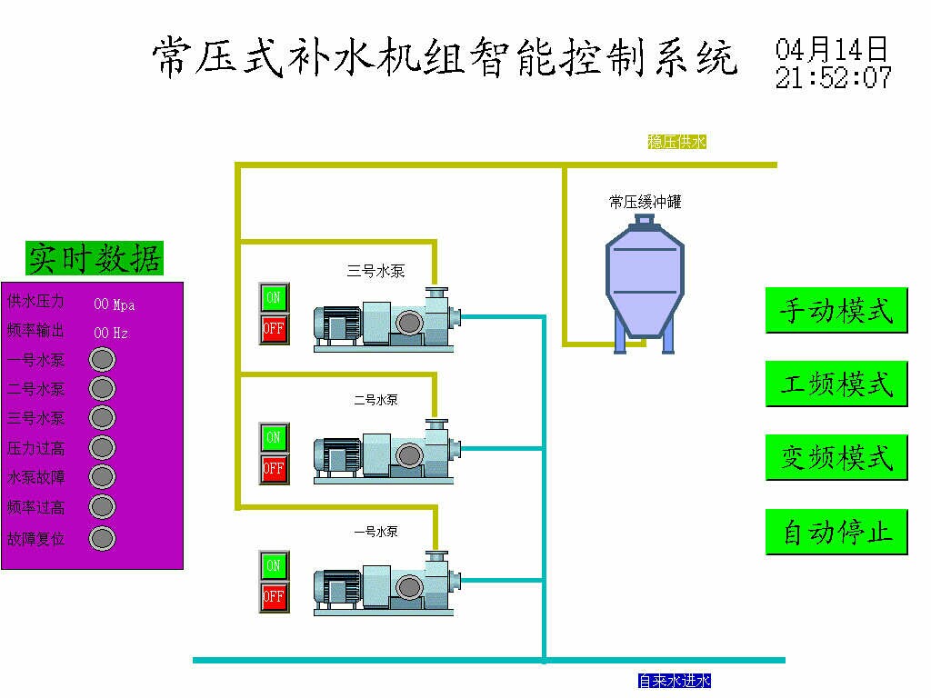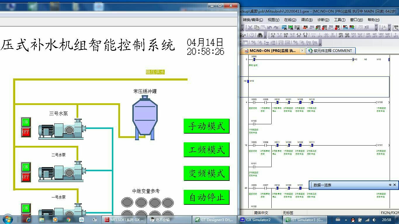 三菱FX系列恒压供水程序和三菱触摸屏程序三台水泵,手动自动均可,自动状态下根据压力调节泵运行数量,具备报警功能和故障自动切换功能