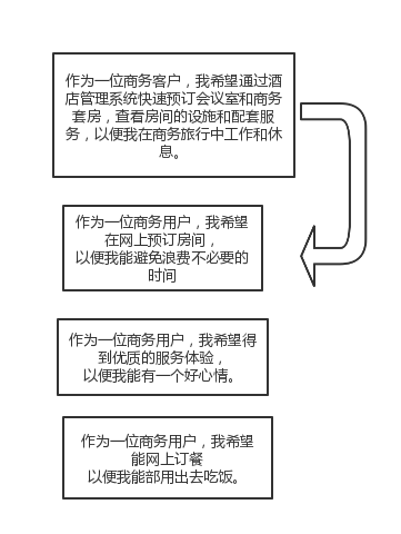 | 目标用户的需求 | 管理酒店房间 提供便捷的预订流程 提供数据安全和可靠性保障 提供客户支持和服务 |