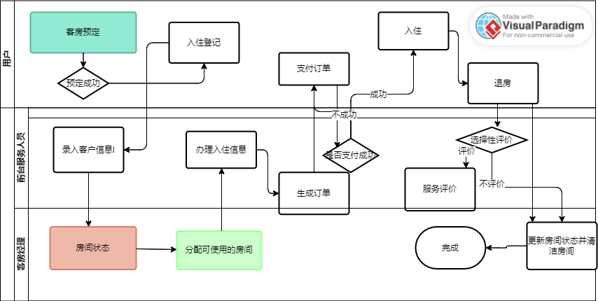 | 普通用户 | 查看房间可用性 预定房间 取消预订 支付订单 服务评价 |