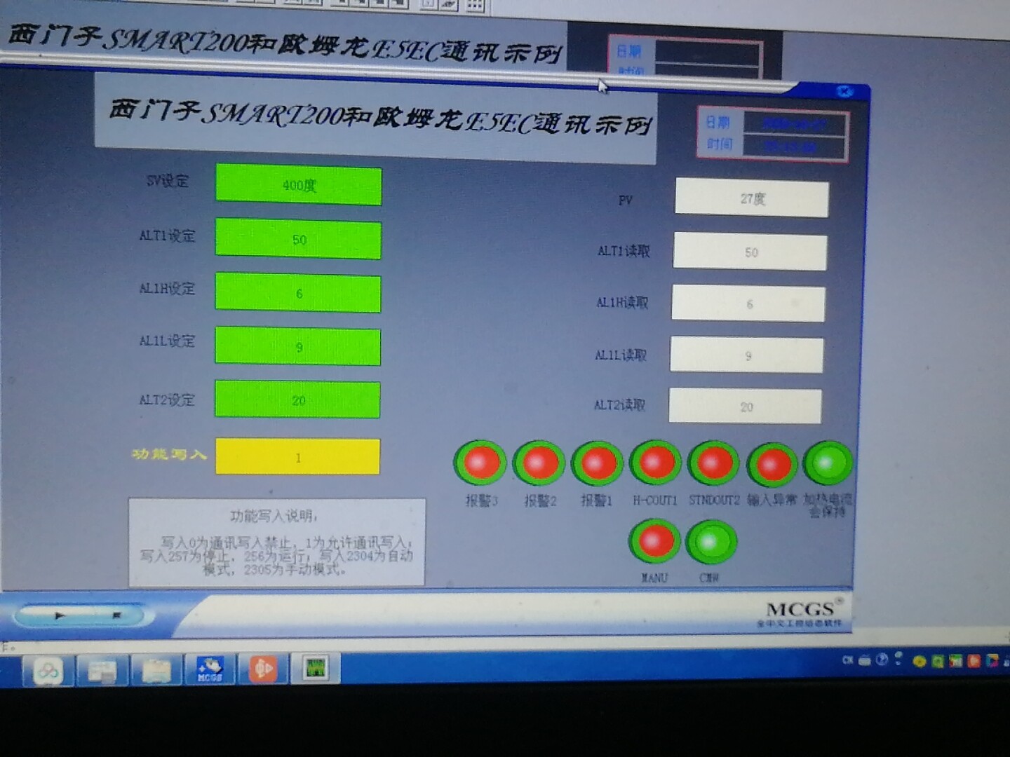 功能:SV温度设定,PV温度读取,功能(自动/手动,通讯允许/禁止…)ALT1.2.3设定,读取及运行状态的读取。