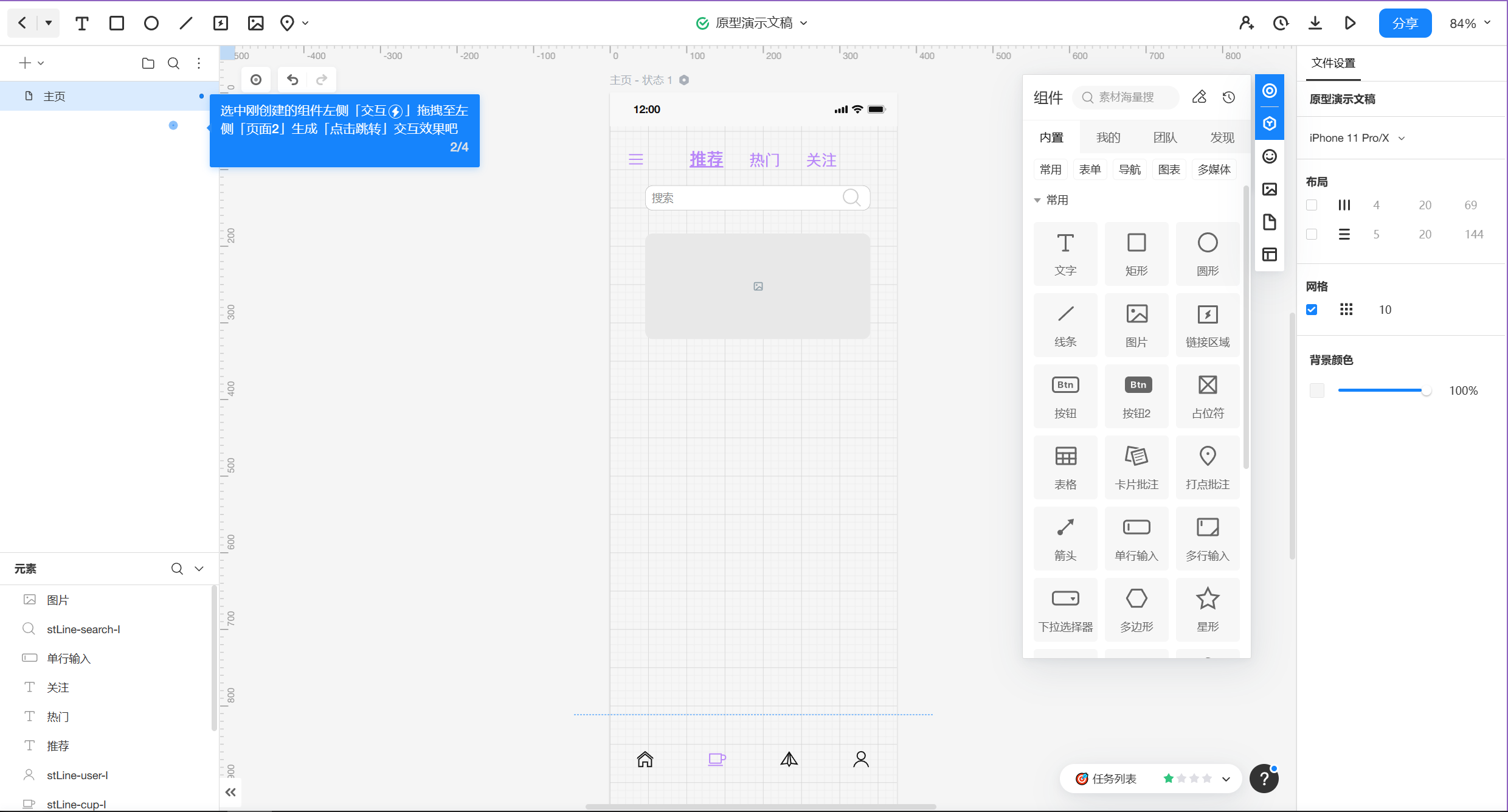 墨刀还有一个方便的强的功能,能通过界面上的组件来设置点击交互功能,模拟在手机上点击后转到的界面页